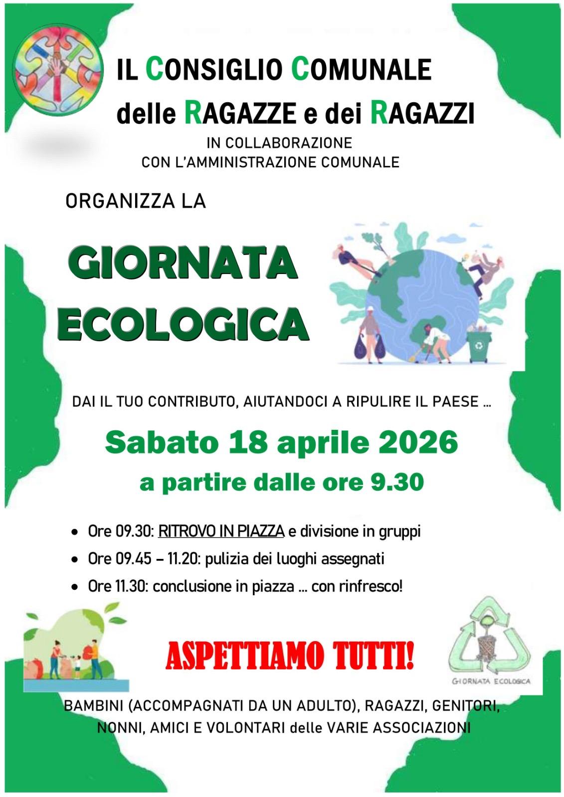 GIORNATA ECOLOGICA sabato 18 aprile 2026 dalle ore 9,30. Conclusione ore 11,30 con rinfresco.