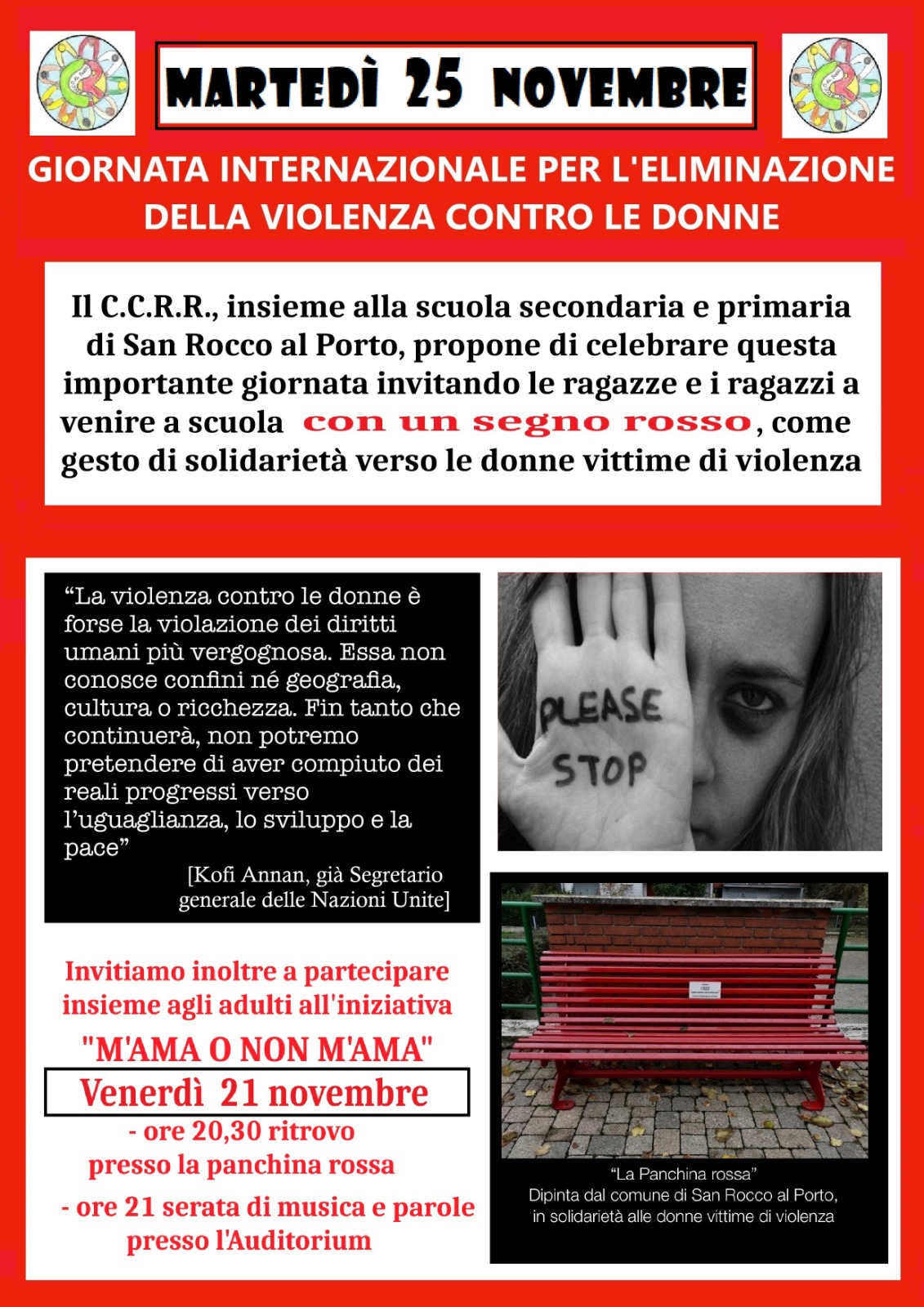 Il CCRR, insieme alla scuola primaria e secondaria di San Rocco al Porto, invita tutte le ragazze e i ragazzi a venire a scuola con un segno rosso: un semplice gesto per dire NO alla violenza e mostrare solidarietà verso tutte le donne che ne sono vittime.