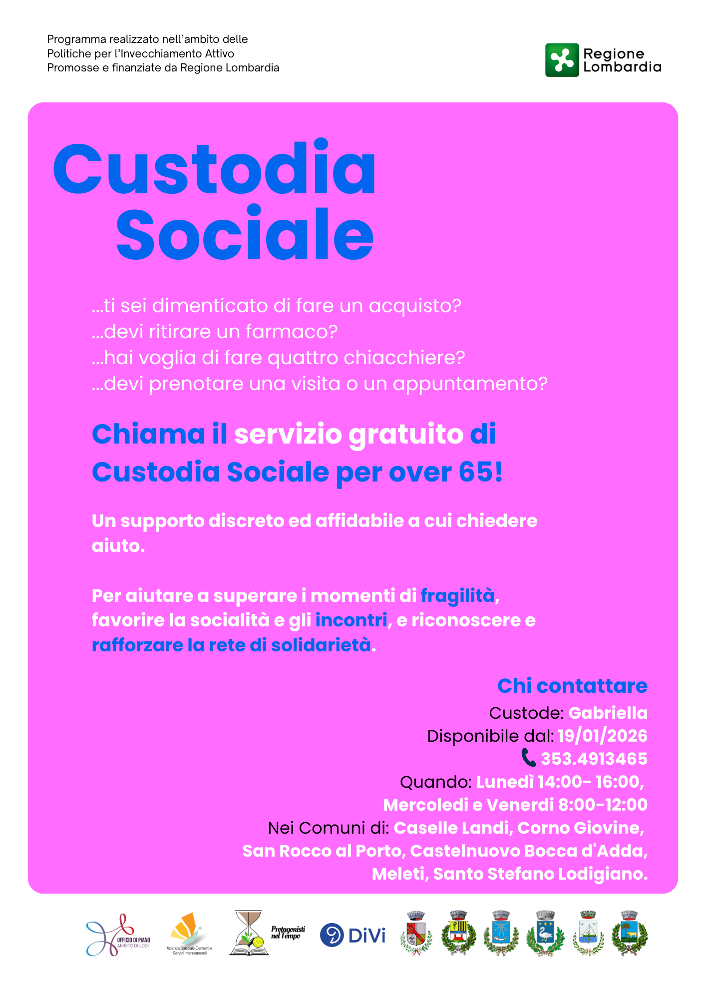 Il Comune di San Rocco al Porto ha aderito alla proposta dell'Ufficio di Piano- Lodi per la realizzazione del progetto di Custodia Sociale, che si propone di offrire una risposta immediata ai bisogni assistenziali "leggeri" delle persone anziane, ed ai loro nuclei familiari, in condizione di bisogno temporaneo, o che siano impossibilitati a svolgere alcune azioni di vita quotidiana, quali ad esempio un acquisto dimenticato, un farmaco da ritirare, prenotare una visita, portare un documento in Comune o semplicemente fare quattro chiacchere..